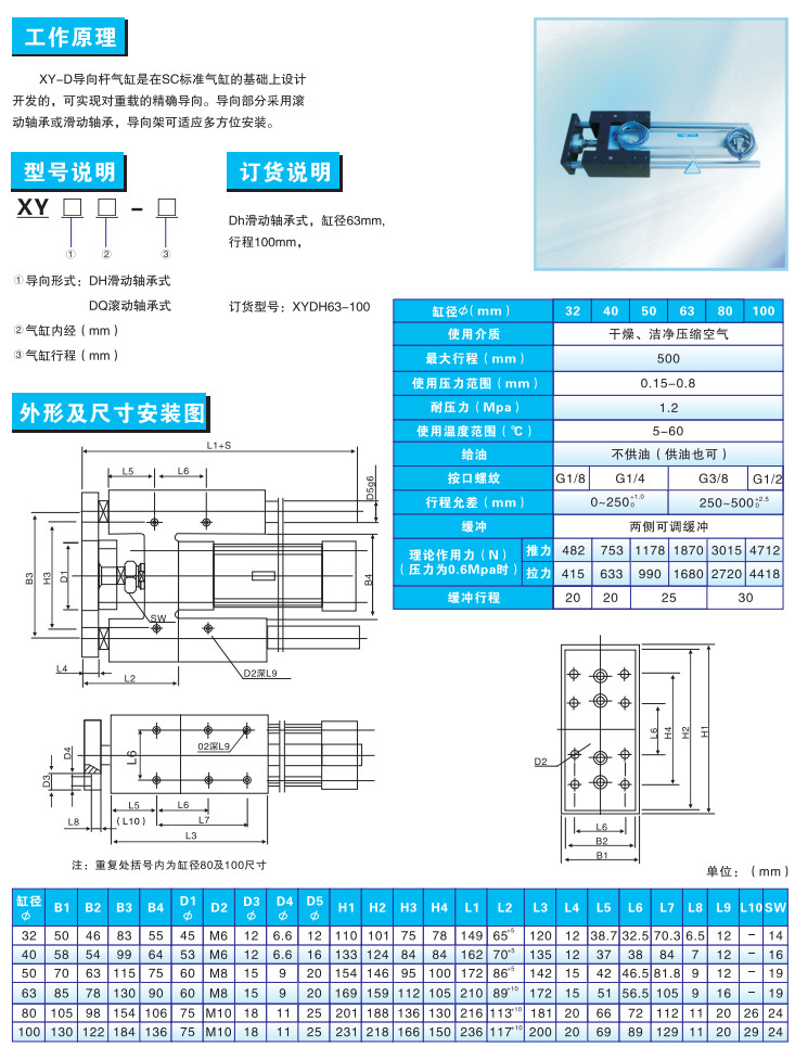 XYDH32-100,XYDH40-100,XYDH50-100,XYDQ63-100,XYDQ80-100,XYDQ100-100,導(dǎo)桿氣缸