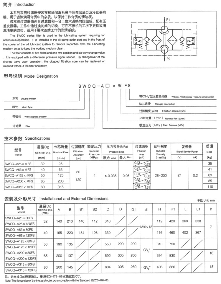 SWCQ-A25*80FS,SWCQ-A63*120FS,SWCQ-A200*80FS,SWCQ-A315*120FS,稀油潤滑系統(tǒng)雙筒過濾器