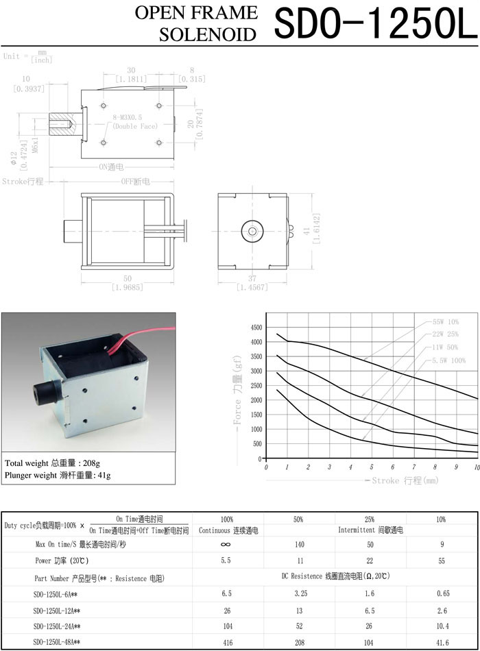SDO-1250L-06A,SDO-1250L-12A,SDO-1250L-24A,SDO-1250L-48A,直動電磁鐵 |