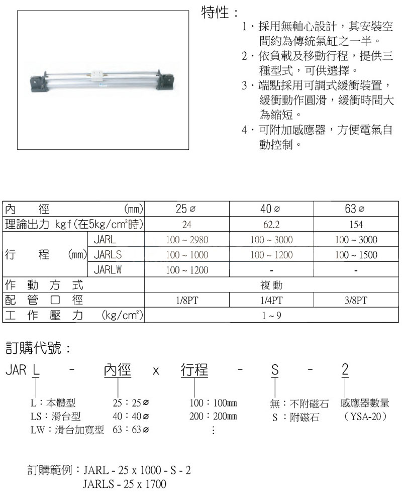 JARL-25,JARL-40,JARLS-25,JARLS-40,JARLW-25,JARLW-40,panix纜繩式無桿氣缸 |