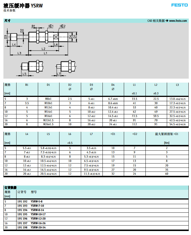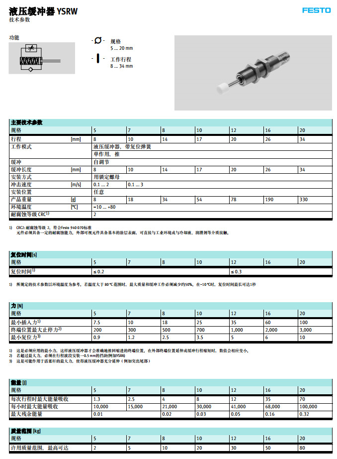 YSRW-5,YSRW-7,YSRW-8,YSRW-10,YSRW-12,YSRW-16,YSRW-20,festo液壓緩沖器