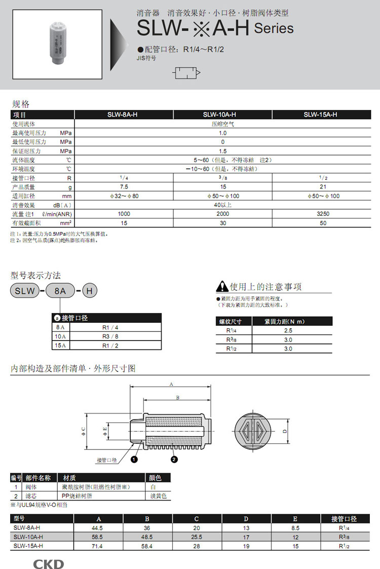 SLW-8A-H,SLW-10A-H,SLW-15A-H,CKD消音器