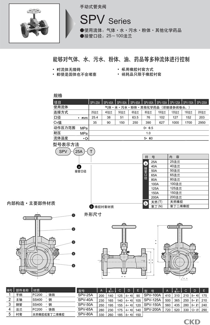 SPV-25A,SPV-40A,SPV-50A,SPV-65A,SPV-80A,SPV-100A,SPV-125A,SPV-150A,SPV-200A,CKD手動(dòng)式管夾閥