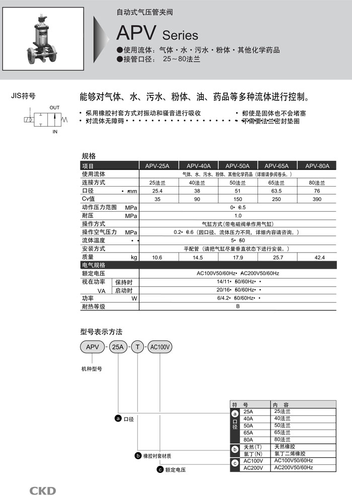 APV-25V-T-AC100,APV-40V-T-AC100,APV-50V-T-AC100,APV-65V-T-AC100,APV-80V-T-AC100,CKD自動式氣壓管夾閥 |