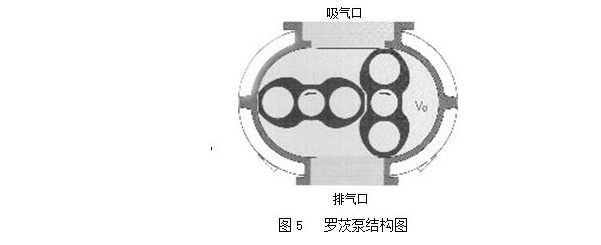 羅茨泵的結(jié)構(gòu)見圖5。在泵腔內(nèi),有一對(duì)8字形的轉(zhuǎn)子相互垂直地安裝在一對(duì)平行軸上,由傳動(dòng)比為1的一對(duì)齒輪帶動(dòng)作彼此反向的同步旋轉(zhuǎn)運(yùn)動(dòng)。在轉(zhuǎn)子之間,轉(zhuǎn)子與泵殼內(nèi)壁之間,保持有一定的間隙,可以實(shí)現(xiàn)高轉(zhuǎn)速運(yùn)行。由于羅茨泵是一種無內(nèi)壓縮的真空泵,通常壓縮比很低,故需要前級(jí)泵。羅茨泵的極限真空除取決于泵本身結(jié)構(gòu)和制造精度外,還取決于前級(jí)泵的極限真空。為了提高泵的極限真空度,可將羅茨泵串聯(lián)使用羅茨泵的工作原理與羅茨鼓風(fēng)機(jī)相似。由于轉(zhuǎn)子的不斷旋轉(zhuǎn),被抽氣體從吸氣口吸入到轉(zhuǎn)子與泵殼之間的空間VO內(nèi),再經(jīng)排氣口排出。由于吸氣后VO空間是全封閉狀態(tài),所以,在泵腔內(nèi)氣體沒有壓縮和膨脹。