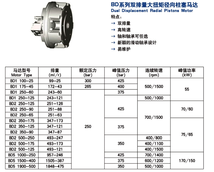 BD1-100-25,BD1-175-45,BD2-250-125,BD2-250-90,BD5-1000-250,雙排量大扭矩徑向柱塞馬達