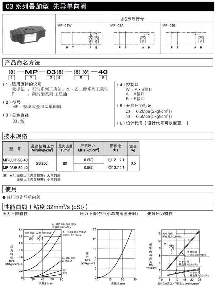 MP-03W-20-40,MP-03W-50-40,MP-03A-20-40,MP-03A-50-40,MP-03B-20-40,MP-03B-50-40,DAIKIN疊加型先導單向閥