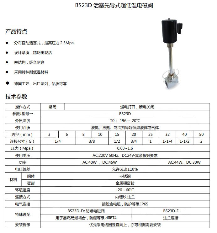 BS23D-DN3,BS23D-DN6,BS23D-DN8,BS23D-DN10,活塞先導(dǎo)式超低溫電磁閥