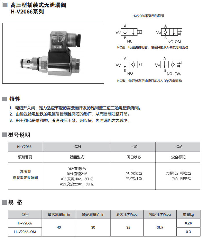 H-V2066-D12,H-V2066-D24,H-V2066-A15,H-V2066-A25,H-V2066-A25-NO-OM,H-V2066-A25-NC,高壓型插裝式無(wú)泄漏閥