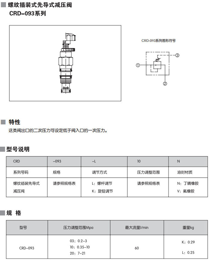 CRD-093-L03N,CRD-093-L10N,CRD-093-L20N,CRD-093-K03N,CRD-093-K10N,CRD-093-L30N,螺紋插裝式先導(dǎo)式減壓閥