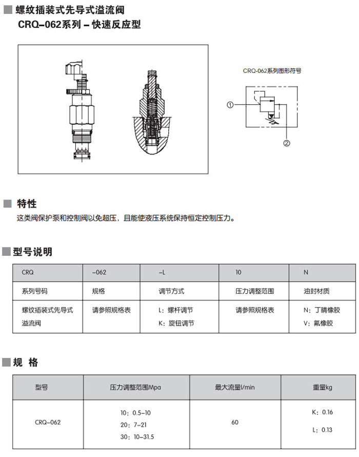 CRQ-062-L10N,CRQ-062-L20N,CRQ-062-L30N,CRQ-062-K10N,CRQ-062-K20N,CRQ-062-K30N,螺紋插裝式先導(dǎo)式溢流閥