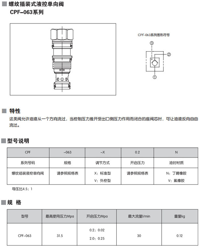 CPF-063-X0.2N,CPF-063-X2.0N,CPF-063-V0.2N,CPF-063-V2.0N,CPF-063-X0.2V,螺紋插裝式液控單向閥