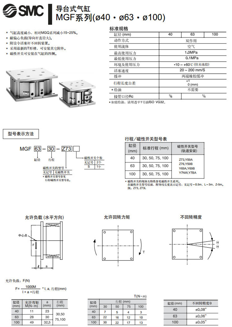 MGF40-30,MGF63-30,MGF100-30,MGF40-50,MGF63-50,MGF100-50,SMC導(dǎo)臺式氣缸