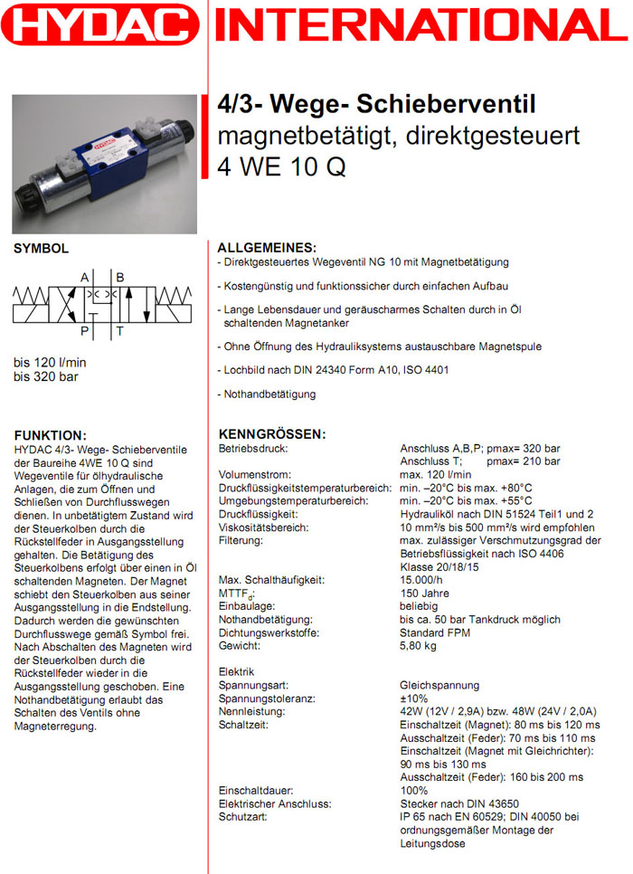 4WE10QS01-12DG/V,4WE10QS01-24DG/V,HYDAC電磁4/3方向滑閥