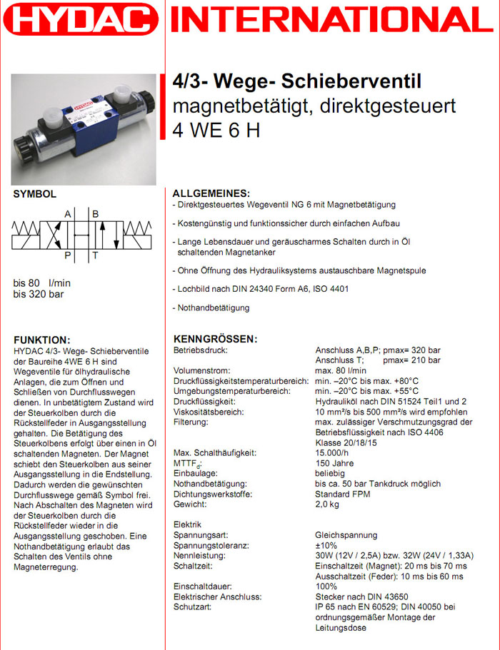 4WE6HS01-12DG/V,4WE6HS01-24DG/V,HYDAC電磁4/3方向滑閥